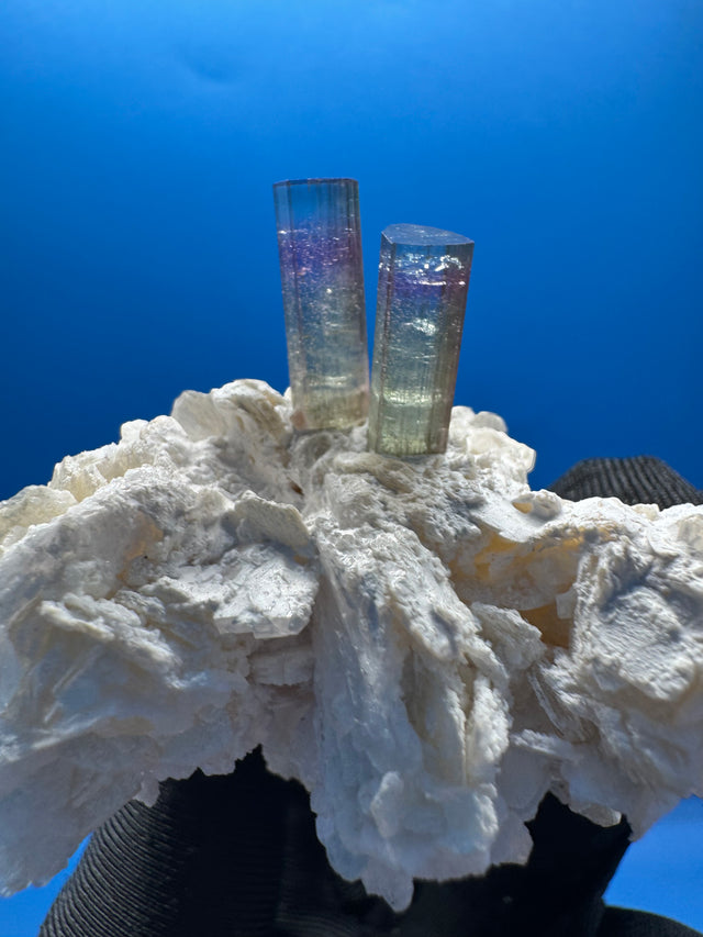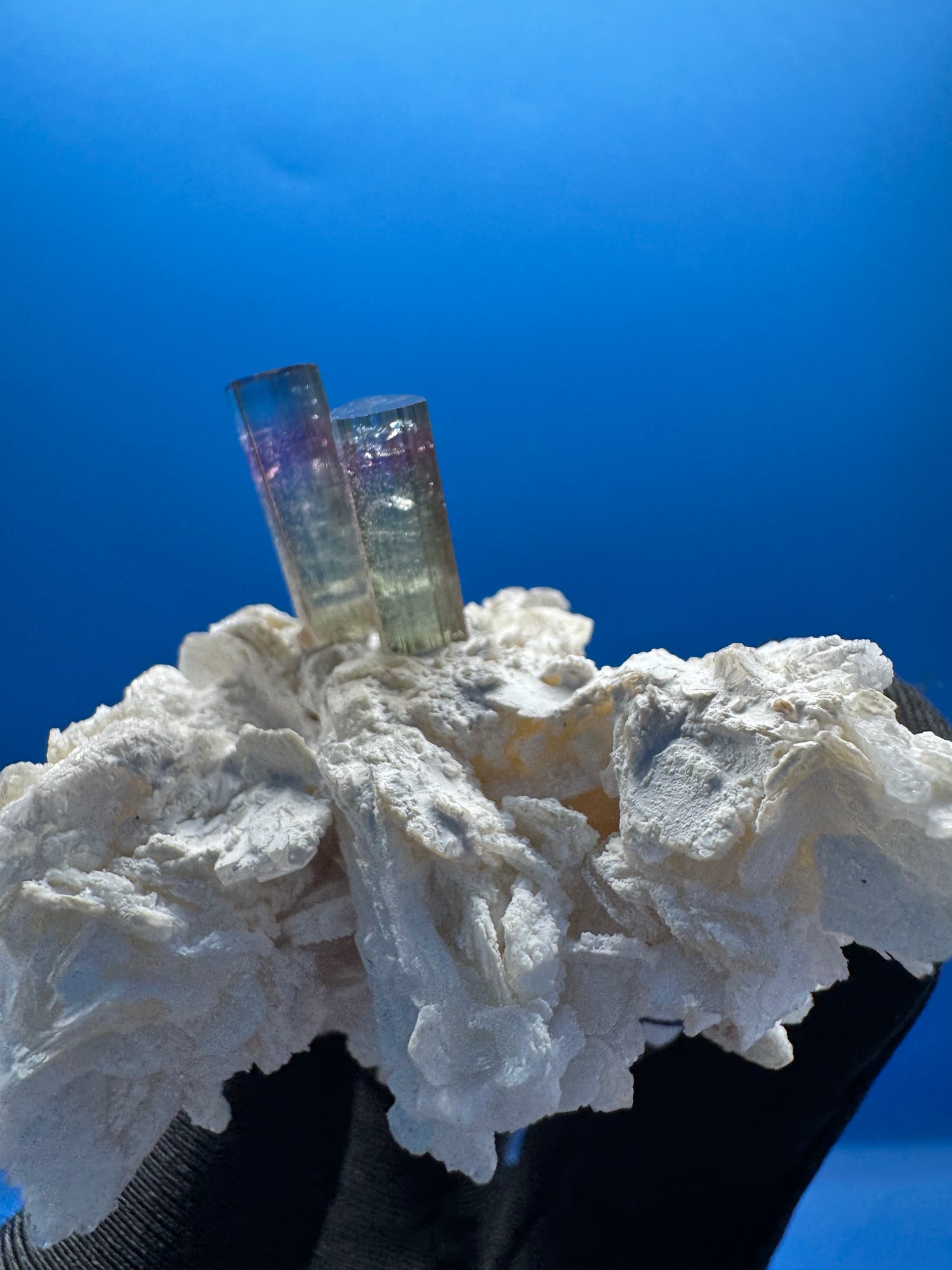 This rare twin bi-color tourmaline specimen from the Astak Nala region features two perfectly formed crystals on natural matrix, showcasing vivid color zoning and excellent clarity. The twin formation is highly sought after, making this piece a museum-quality specimen for serious collectors. Its vibrant contrast and aesthetic composition make it both a visually stunning and highly desirable addition to any mineral collection.
