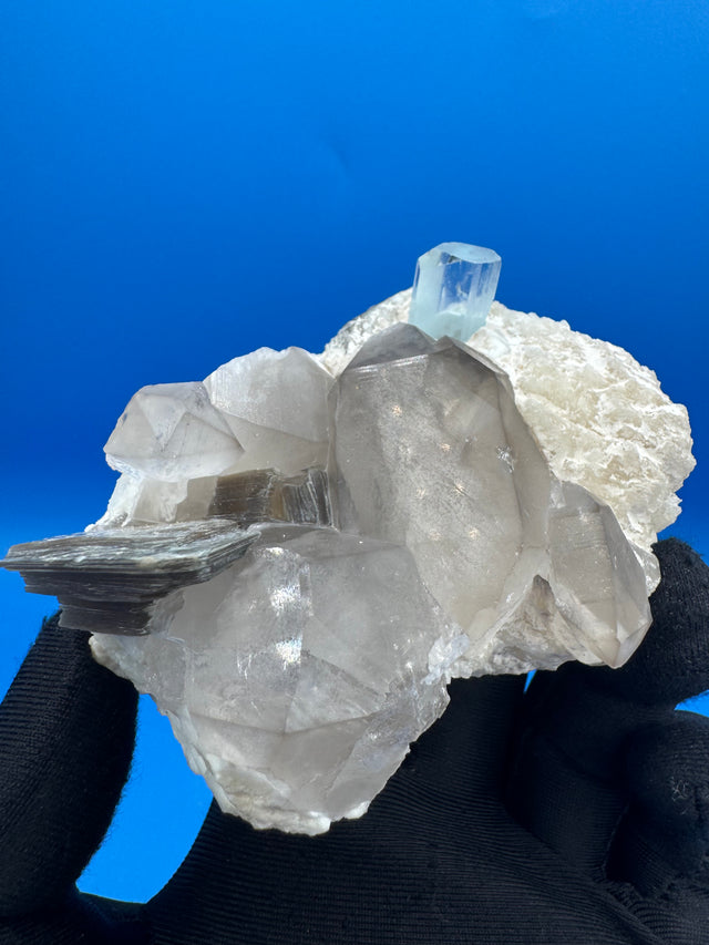 This beautiful Aquamarine specimen from Shigar Valley, Pakistan features a striking Aquamarine crystal naturally perched on its matrix alongside Feldspar and Quartz. The vibrant blue of the Aquamarine contrasts elegantly with the white Feldspar and clear Quartz, creating a visually stunning and highly collectible mineral display piece.