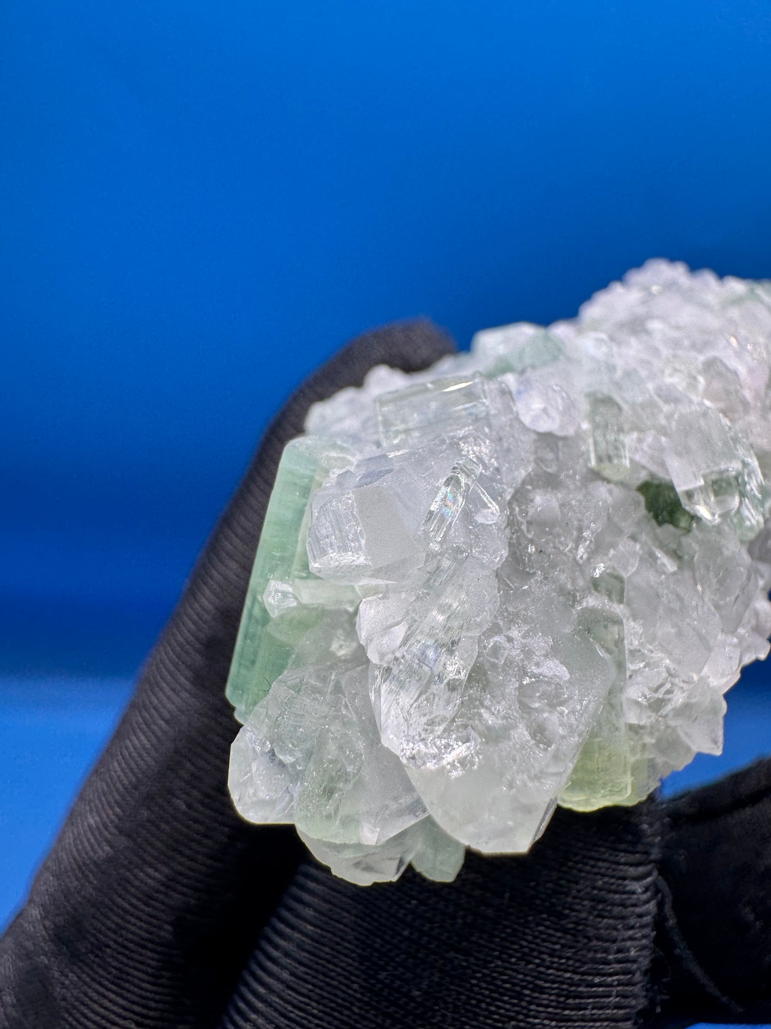 This exquisite specimen features vibrant green Tourmaline crystals naturally perched on a clear Quartz matrix, sourced from the renowned Skardu region of Pakistan. With striking color, sharp terminations, and excellent clarity, it is a standout piece for collectors and display enthusiasts alike.