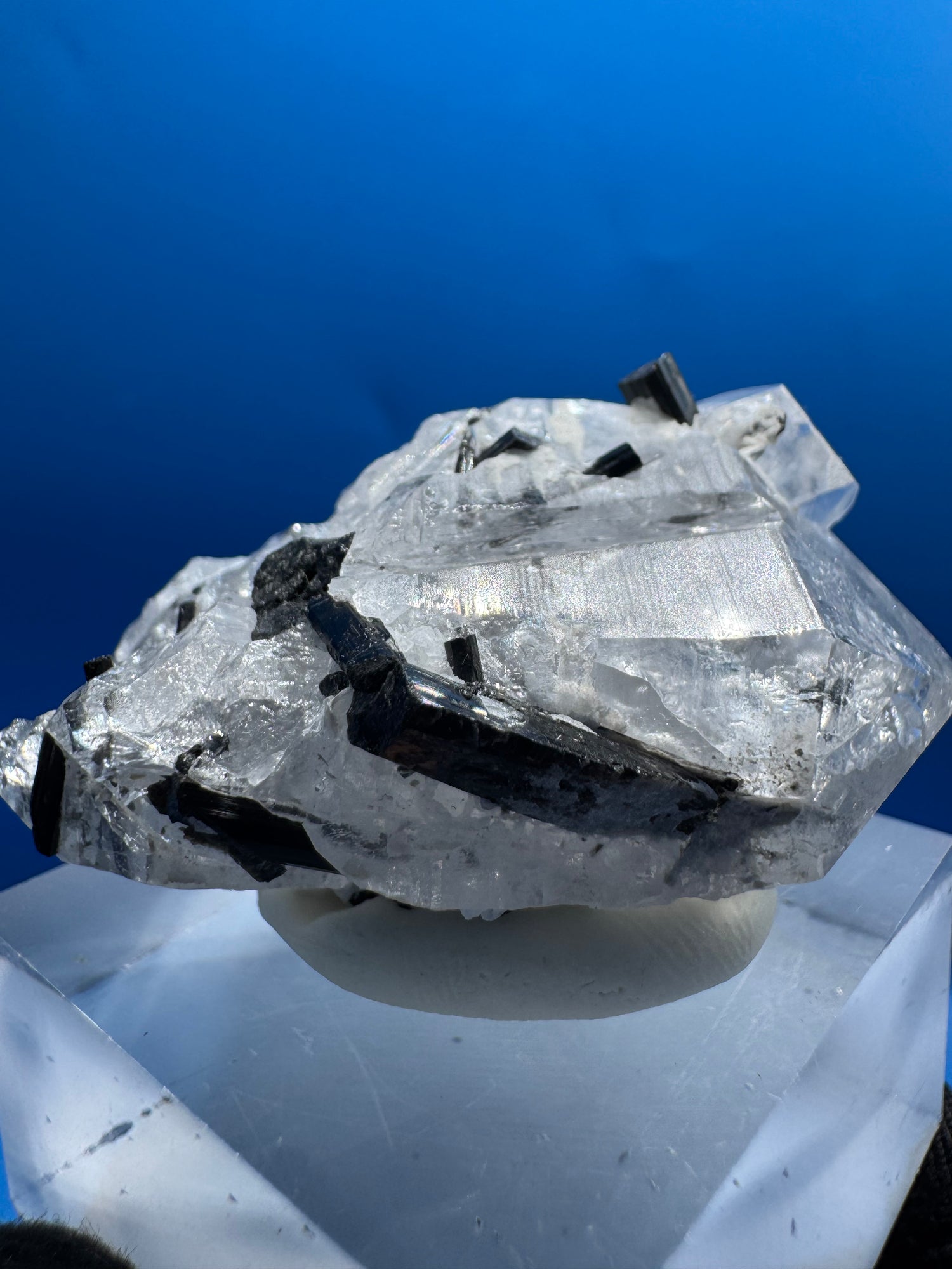 This stunning Black Tourmaline and Quartz specimen from Skardu, Pakistan features beautifully terminated Quartz with excellent clarity. Striking Black Tourmaline crystals are embedded within and growing out of the host rock, creating a visually captivating and highly collectible mineral display piece. The specimen comes with a clear acrylic stand for an elegant, ready-to-display presentation.