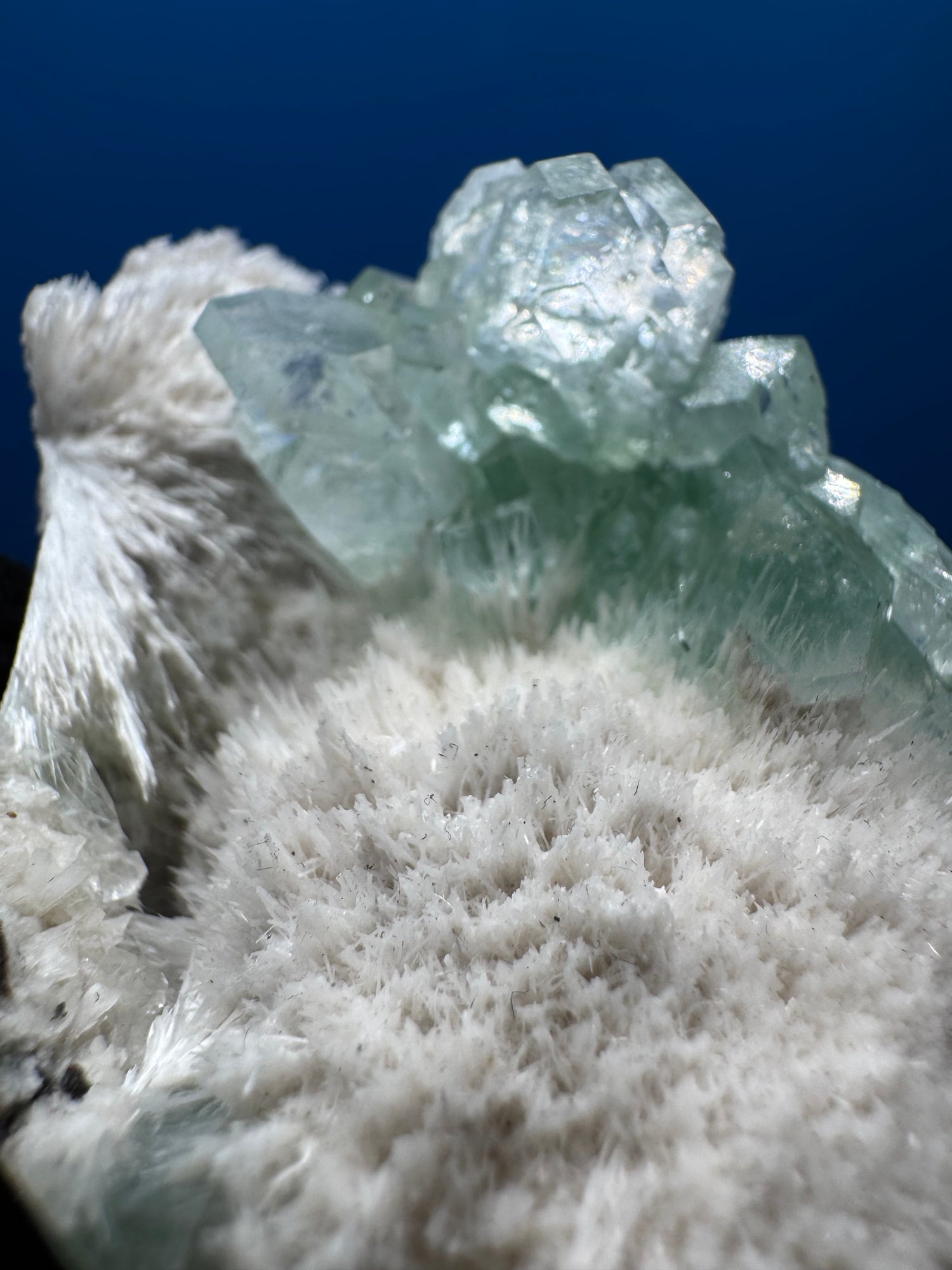 This rare Green Apophyllite “flower” specimen from Pune, India features exceptional crystal terminations and vibrant natural green coloration. The apophyllite is beautifully accented by a delicate Mesolite flower, creating a striking and highly aesthetic mineral association prized by collectors.