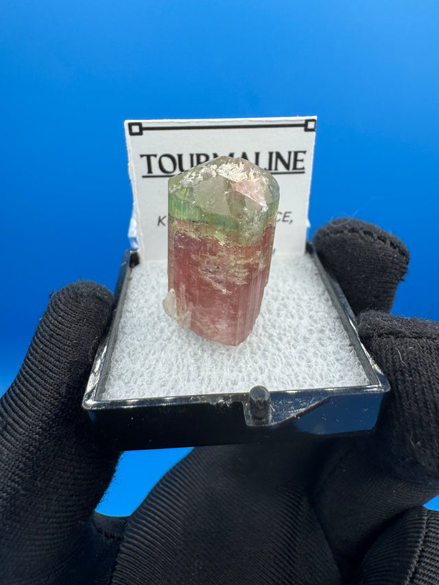 This Watermelon Tourmaline crystal highlights the exceptional beauty of Afghan tourmalines. Its vivid color zoning and natural elegance make it a standout addition to any fine mineral or crystal collection.